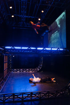Length : 55 min Xavier Kim wants to produce ‘complete’ circus, containing cartoonish gags for the kids as well as social and political satire for the grown-up audience. “People, dreams, fate, politics, democracy, daily life, global blossoming, choice, communication, all these are the facets of a thematic Rubik’s Cube at the heart of a first production, where four performers jump, dance, run, climb, talk and writhe on stage...", explains Xavier Kim. As a circus artist with astounding energy, Kim sees the stage as the ideal venue for permanent revolution. “At the start, I wanted to handle a dual language. As if slipping on a protective outfit and going towards the strange phenomenon we like to call reality, which - more often than not, according to some people - tends to crush us. I was also interested in the ways it is possible to change it (or not). The aim being the answer to the question that invariably haunts us on challenging days, when we find ourselves brushing our teeth: why on earth am I not a superhero? Or the answer to questions such as the following, which is also a good one: If we could really do ‘something’, if everything became possible together, what would we do?" Xavier Kim Original Idea by Xavier Kim. Lighting by Benjamin Guillet. Music by Frédéric Blin. Graphics and Videos: Florent Tarrieux. Set Design by Manu Cealis. Costumes by Kennory Kim with the help of Yann Ecauvre, Xavier Kim, Soleil Koster, and Leonardo Mayorga.